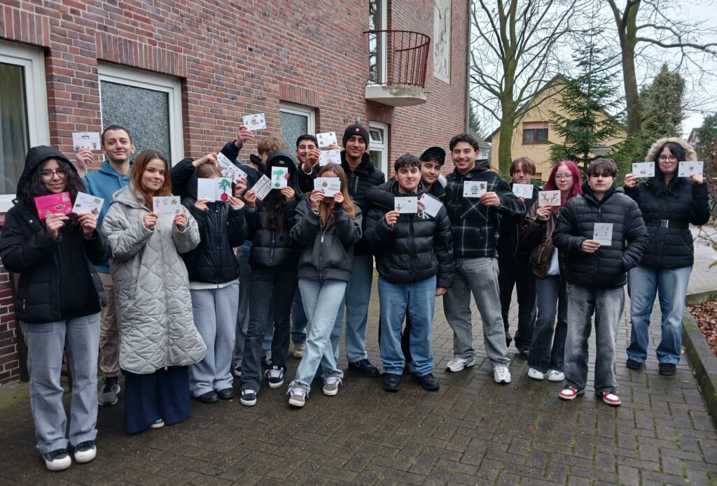 Freude schenken Unter diesem Motto hat die Klasse 10a am 02.12.2025 das Seniorenheim St. Stephanus besucht. Die Schülerinnen und Schüler übergaben der Verwaltung 40 selbst gestaltete Weihnachtskarten für die Bewohner. Im Rahmen des Werte und Normen Unterrichts ging es dabei um das Thema, wie man anderen Menschen eine Freude machen kann.