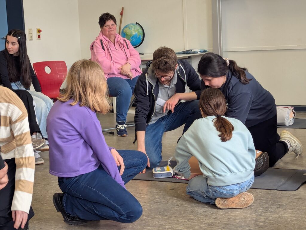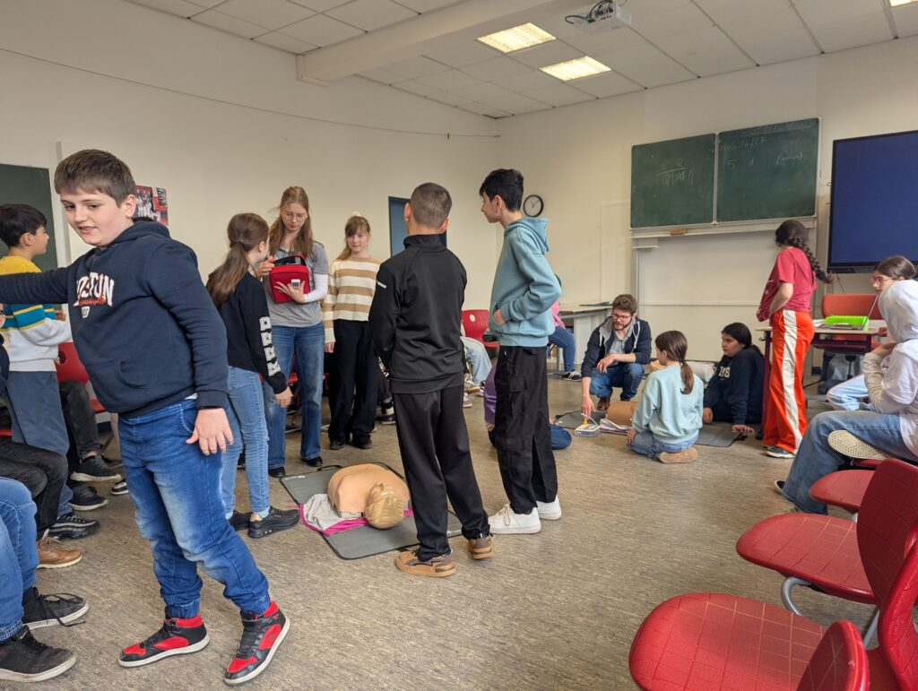 Bereits im November nahmen die Schülerinnen und Schüler des 5. und 6. Jahrgangs an einem Erste-Hilfe-Workshop teil. Am 16. und 17. März kamen die Medizinstudenten der Uni Oldenburg zu einem Vertiefungskurs im Rahmen des Projektes „reStart“/“machEinDruck“ wieder zu uns in die Schule. Zunächst wurde das Gelernte aus dem ersten Kurs noch einmal wiederholt. Danach lernten die Schülerinnen und Schüler den „DeFi“ kennen. Der Einsatz des „DeFis“ wurde erklärt und im Anschluss ging es in die Übungsphase.