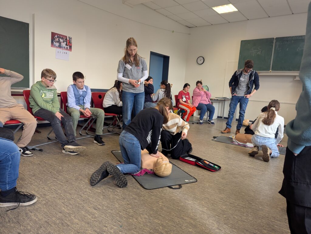Im letzten und auch zu Beginn diesen Schuljahres zeigten Medizinstudentinnen der Uni Oldenburg im Rahmen des Projekts „reStart“/„machEinDruck“, SchülerInnen und Schülern aus den unteren Klassen, was im Notfall zu tun ist und wie alle ErsthelferInnen sein können. Anhand einer klaren Reihenfolge der Handlungsschritte, die nach und nach eingeübt wurden, erlangten die SchülerInnen Vertrauen in ihre Fähigkeit, im Falle des Falles helfen zu können. Zum Abschluss des Kurses erhielten die SchülerInnen ein Zertifikat für die Teilnahme und freuen sich bereits auf den nächsten Workshop, in dem das Gelernte vertieft und erweitert wird.